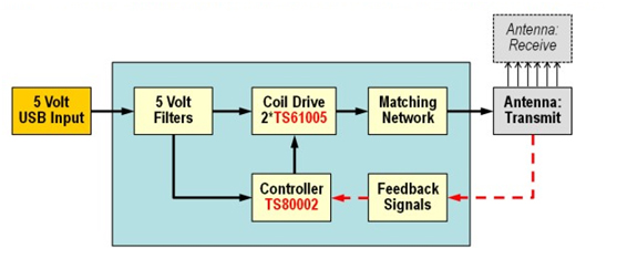 集成電路。TS80002控制系統(tǒng)實現(xiàn)無線電力傳輸協(xié)議,而TS61005是為發(fā)射器天線供電的MOSFET驅動器。