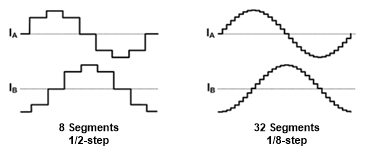 通常,步進電機不是由模擬線性放大器驅動;而是由PWM電流調節(jié)驅動,把線性的正弦波信號轉換成了離散的直線段信號。 正弦波可被分成多段,隨著段數(shù)的增加,波形不斷接近正弦波。 實際應用中,段數(shù)多從4到2048或更多,大多數(shù)步進驅動IC采用4到64段細分。整步驅動,每一時刻只有一個相通電,兩相電流交替和電流方向切換,使得一共產生四個步進電機機械狀態(tài)。半步驅動,比整步驅動方式相對復雜一些,在同一時刻,可能兩個相都需要被通電,如圖1所示,使電機的步進分辨率提高了一倍。細分驅動,電機轉子走一步的角度將會隨著細分數(shù)的增加而減小,電機轉動也越來越平穩(wěn),例如把一個32段細分序列稱為八分之一步驅動模式(見圖1)。