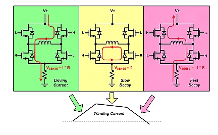 傳統(tǒng)的步進電機峰值電流控制,通常只檢測通過線圈的峰值電流。 當預期的峰值電流達到后,H橋就會切換導通狀態(tài),使得輸出電流衰減(快衰減,慢衰減,或兩者的組合),持續(xù)一定固定時間,或等一個PWM周期結束。電流衰減時,驅動IC無法檢測輸出電流,從而導致一些問題。