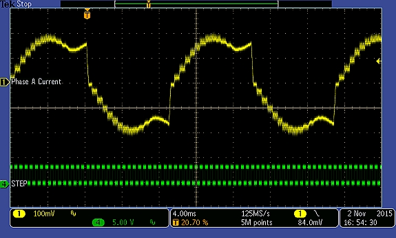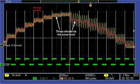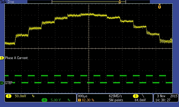 接著,在相同設置和試驗條件下,用市面上通用的雙極步進驅動器來驅動電機,采用傳統(tǒng)的峰值電流控制和使用外部檢測電阻器。該驅動器電流增大時采用慢衰減模式,電流減小采用混合衰減模式。