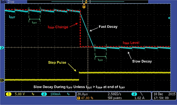通常情況下, MP6500工作在慢衰減模式下。然而,當一個固定關斷時間結束,慢衰減結束后,如果當前繞組電流仍高于預期水平,快衰減模式會被開啟以用來迅速減小驅動電流到所需值。 這種混合控制模式,使得驅動電流快速下降到零,同時又保證平均電流盡量接近設定值。 當step跳變時,快衰減就被采用使得當前電流迅速被調整到零,如圖6所示。