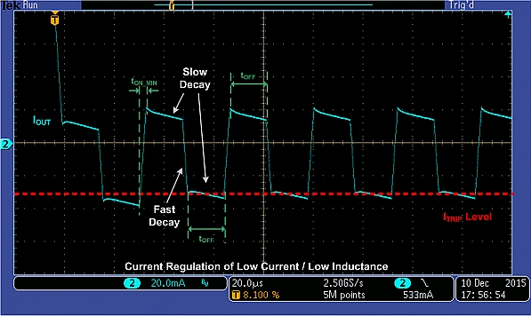 如果電源電壓高,電感值低,或所需的峰值電流幅值很低,電流很有可能高于設定值。由于blanking time,每個PWM周期都會有一個最小導通時間,此時許多傳統(tǒng)的步進電機驅動器無法控制繞組電流。如果發(fā)生這種情況,MP6500會不斷采用快衰退模式來保證繞組電流一直不超過設定值(見圖7)。