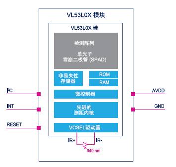 VL53L0X包含基于一個SPAD(單光子雪崩二極管)感應器陳列和一個符合人體一級安規(guī)的VCSEL(垂直腔面發(fā)射激光器)的集成940nm光源,與嵌入式微控制器上運行的算法一起使用時,可以直接確定以毫米為單位的目標物體的距離,即使是在具有挑戰(zhàn)性的工作條件下,并且與目標反射率無關。VL53L0X采用一個超低功耗的系統(tǒng)架構,非常適合用于無線和IoT應用。VL53L0X具有完整的文檔包,例如源代碼和軟件API(應用編程接口),它與廣發(fā)的微控制器和處理器兼容。