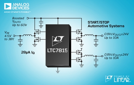 Analog Devices, Inc. (ADI) 宣布推出 Power by Linear™的 LTC7815,該器件是一款高頻 (高達 2.25MHz) 三路輸出 (降壓、降壓、升壓)、同步 DC/DC 控制器,可在汽車冷車發(fā)動情況下將所有輸出電壓保持在穩(wěn)壓狀態(tài)。12V 汽車電池在引擎重新起動或冷車發(fā)動期間會降至低于 4V,因而導致信息娛樂系統(tǒng)和其他依靠 5V 或更高電壓供電工作的電子產品發(fā)生復位。高效率同步升壓型轉換器給兩個降壓型轉換器饋電,可在汽車電池電壓下降時避免出現(xiàn)輸出電壓壓差,在怠速時關閉引擎以節(jié)省燃料的汽車啟/停系統(tǒng)中,這是一個有用的特性;蛘,降壓型控制器也可以從一個通用型三路輸出控制器的輸入供電。
