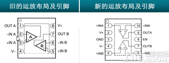 長時(shí)間工作的電子器件都會面臨散熱的問題,傳統(tǒng)音頻運(yùn)放布局通常左右兩邊是不對稱的,所以,工程師們通常為左右不同的散熱方式而大傷腦筋。如下圖所示,傳統(tǒng)的運(yùn)放布局的兩雙路運(yùn)放設(shè)計(jì)是一個(gè)運(yùn)放朝左,一個(gè)運(yùn)放朝右,而且芯片內(nèi)部不是對稱放置。這樣當(dāng)工作芯片發(fā)熱時(shí),它的熱不是對稱著熱的,在音頻界如果器件不對稱發(fā)熱會使器件產(chǎn)生失真。