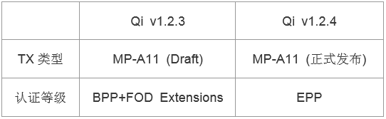 2. 在Qi v1.2.3版本下,該類發(fā)射端通過(guò)的是BPP+FOD Extensions認(rèn)證,而在新發(fā)布的Qi v1.2.4下,對(duì)發(fā)射端認(rèn)證等級(jí)進(jìn)行了簡(jiǎn)化,會(huì)通過(guò)EPP(MP-A11)認(rèn)證。