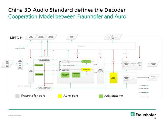 MPEG-H是一組成套的音頻技術(shù),包括編碼、傳輸、解碼,直到終端做聲音還放。即可通過有線電視也可以通過互聯(lián)網(wǎng)傳播。下圖是Fraunhofer IIS與捷成世紀(jì)合作模式,為中國3D音頻標(biāo)準(zhǔn)定義的解碼器。