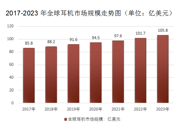 數(shù)據顯示,隨著全球耳機生產技術和材料的不斷升級,智能產品市場的發(fā)展,全球耳機市場規(guī)模有望在2023年達到105.8億美元。在全球耳機出貨量穩(wěn)速增長的情況下,耳機行業(yè)正在逐步升級,主要表現(xiàn)為無線耳機替代有線耳機,藍牙耳機占比提升,同時耳機走向智能化。