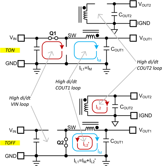 圖 1. 降壓轉(zhuǎn)換器中的電流環(huán)路。VIN 環(huán)路為高 di/dt 環(huán)路。