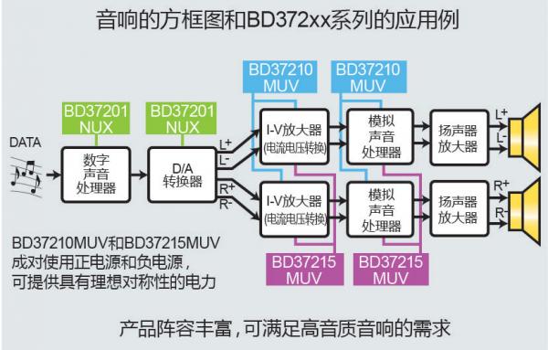 產(chǎn)品陣容包括:非常適用于在低電壓下工作的數(shù)字器件(DA轉(zhuǎn)換器、DSP等)的BD37201NUX、非常適用于在高電壓或正負(fù)兩個(gè)電源下工作的模擬器件(聲音處理器、電流-電壓轉(zhuǎn)換放大器等)的BD37210MUV(正電源)和BD37215MUV(負(fù)電源)。未來還會在這些產(chǎn)品的基礎(chǔ)上繼續(xù)擴(kuò)充產(chǎn)品陣容,強(qiáng)有力地支持音響設(shè)備的高音質(zhì)化發(fā)展。