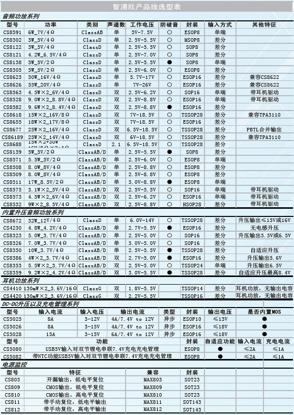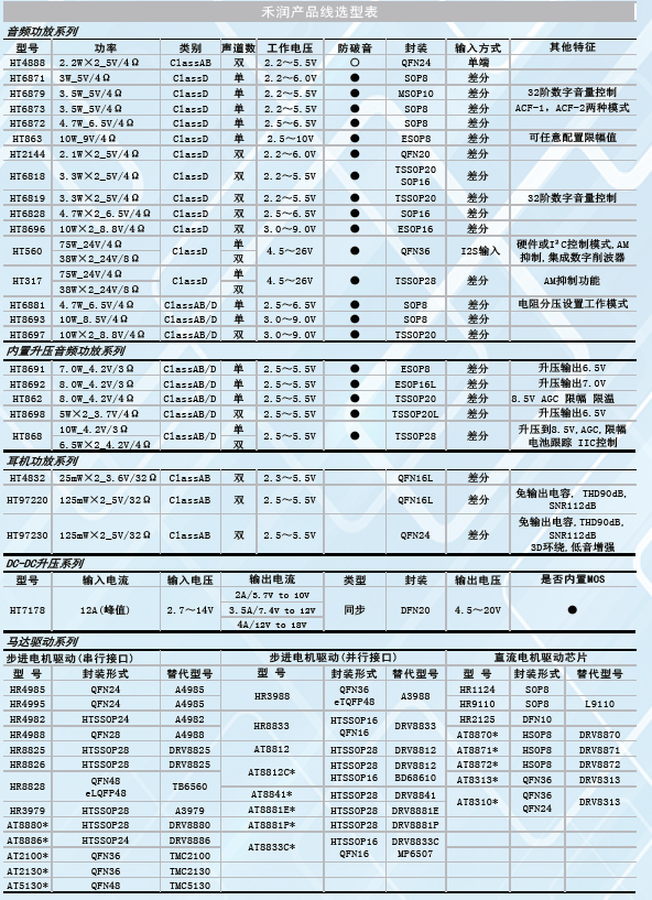 | ·I2S數字功放IC/內置DSP音頻算法功放芯片 ·馬達驅動IC ·2.1聲道單芯片D類功放IC ·內置DC/DC升壓模塊的D類功放IC ·鋰電充電管理IC/快充IC ·無線遙控方案 ·直流無刷電機驅動芯片 |