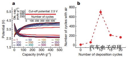 該文作者用MoS2陰極、有該保護(hù)層的鋰陽極,EMIM-BF4/DMSO (25%/75%)混合電解液制成了全電池,并在人工配成的類空氣氣氛中進(jìn)行實(shí)驗。第一周的反應(yīng)開始發(fā)生在2.92V,與Li2O2形成的電勢2.96V非常接近,說明了主反應(yīng)進(jìn)行良好,在3.75V時達(dá)到了500mAh/g的比容量。第一周循環(huán)的極化電壓差為0.88V,50周后為1.3V,550周后為1.62V。而在反應(yīng)達(dá)到700周后,電池依然可以工作;與此形成對比的是,不經(jīng)保護(hù)的鋰空氣電池只能循環(huán)10次左右就已經(jīng)失效。對于保護(hù)層的厚度選擇,該文作者認(rèn)為:太薄的保護(hù)層會導(dǎo)致電解液分解,厚的保護(hù)層又會導(dǎo)致大的電荷轉(zhuǎn)移電勢以及副反應(yīng),因此需要優(yōu)化。經(jīng)實(shí)驗,發(fā)現(xiàn)10次循環(huán)制備的保護(hù)層厚度最為合適。