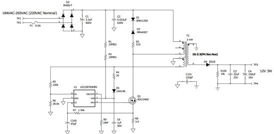 在圖 1 的實(shí)例中,要使用通用 AC 輸入(85VAC 至 264VAC)實(shí)現(xiàn) 12V/50mA 的偏置電源,需要為 R2 應(yīng)用 2kΩ 的最大電阻器。即便使用串聯(lián)電阻器,仍需補(bǔ)償 BJT 上的損耗,在輸入為 264VAC 時其可高達(dá) 5W。