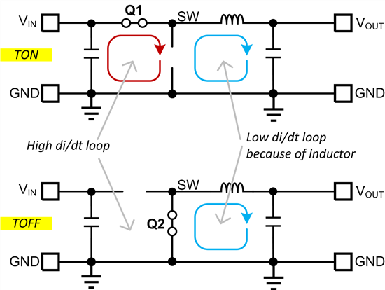 圖 1. 降壓轉(zhuǎn)換器中的電流環(huán)路。VIN 環(huán)路為高 di/dt 環(huán)路。