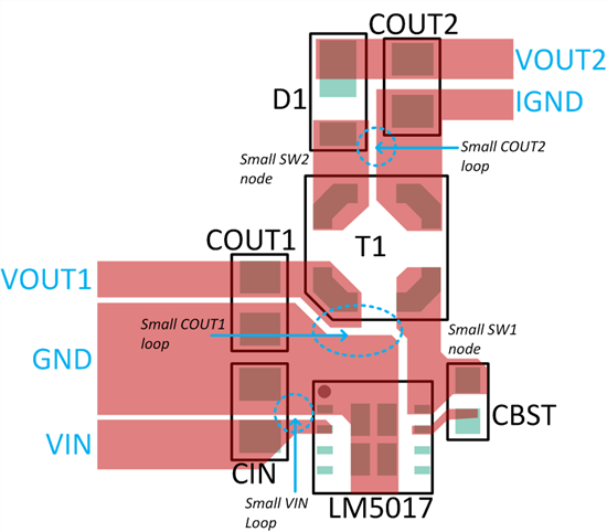 圖 3.基于 LM5017 的 Fly-Buck 布局可對(duì) di/dt 環(huán)路和高 di/dt SW1,2 節(jié)點(diǎn)面積進(jìn)行最小化。 |