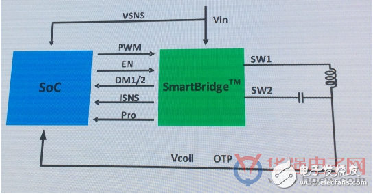 伏達(dá)推出的第一代Gen 1 TX解決方案自稱是世界上最為高度集成的TX解決方案,其方案主要由一顆控制芯片和一顆智能全橋芯片SmartBridge構(gòu)成。從下圖來(lái)看,整體方案確實(shí)簡(jiǎn)潔。另外編者認(rèn)為,其中的智能全橋芯片可謂是該公司最具特色的產(chǎn)品。伏達(dá)把所有功率器件(包括4個(gè)MOSFET,4個(gè)Driver)都集成到SmartBridge中,因此其整個(gè)發(fā)射端系統(tǒng)由兩顆芯片就可以實(shí)現(xiàn),對(duì)下游產(chǎn)品工程師來(lái)說(shuō)系統(tǒng)設(shè)計(jì)非常簡(jiǎn)單。