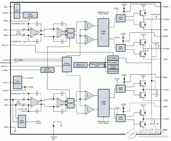 The TPA3116D2 is a 50-W (per channel), efficient, stereo, digital-amplifier power stage for driving two bridge-tied speakers or a single parallel bridge-tied load. The TPA3116D2 can drive a speaker with an impedance as low as 3.2 Ω (4 Ω typical)。