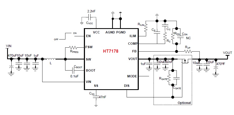 HT7178還支持可編程的軟啟動(dòng),以及可調(diào)節(jié)的開(kāi)關(guān)峰值電流限制。另外,HT7178集成了輸出關(guān)斷功能的柵極驅(qū)動(dòng),在SD狀態(tài),可完全斷開(kāi)輸入電源。此外,該器件還提供有22V輸出過(guò)壓保護(hù)、逐周期過(guò)流保護(hù)和熱關(guān)斷保護(hù)。