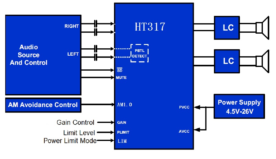 HT317具有豐富的功率限制能,以滿足各類應(yīng)用。一種是限幅功能(PLIMT),即在輸出端限制在輸出端限制其最大輸出擺幅低于設(shè)定值 ,可避免意外的超額輸出功率損壞喇叭 。另一種為 自動增益控制功能(AGC),開啟后,可有效改善因輸入幅度過大或者電源壓降低造成的破音失真。