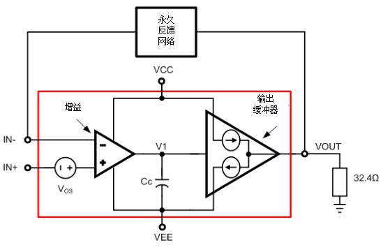 圖1是驅(qū)動(dòng)耳機(jī)負(fù)載的運(yùn)算放大器的簡(jiǎn)化 。它包括兩個(gè)級(jí)——一個(gè)增益級(jí)和一個(gè)輸出緩沖器,以及一個(gè)補(bǔ)償電容器、Cc和一個(gè)補(bǔ)償電壓,Vos。如圖所示,輸出緩沖器是一個(gè)單位增益級(jí),能夠吸收電流和提供電流。
