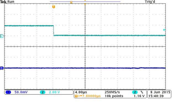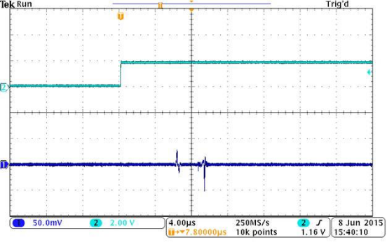 圖3和圖4分別顯示了OPA1622在啟用和禁用期間的性能。只有極小的輸出瞬態(tài)會(huì)伴隨啟用或禁用的過(guò)程。輸出瞬態(tài)發(fā)生的時(shí)間極短,因此使用耳機(jī)時(shí)聽(tīng)到的可能性不大。