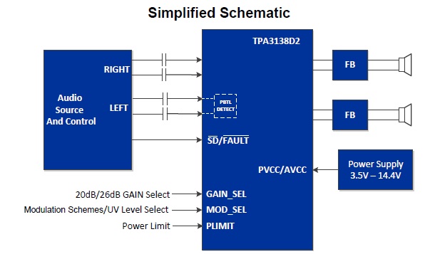 The TPA3138D2 is fully protected against shorts and overload; It also includes a power limiter and DC detection circuit for speaker protection. The short-circuit and thermal protections include an auto-recovery feature.