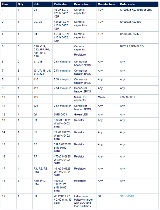 The STEVAL-ISB035V1 is an evaluation board based on the STBC03 battery power management IC, integrating a linearcharger for single-cell Li-Ion batteries with battery protection functions, an LDO regulator and two SPDT load switches.