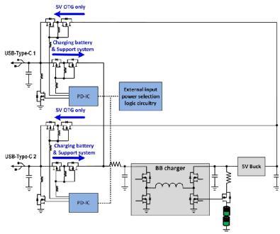 圖1顯示了一種新的USB-C架構(gòu),該架構(gòu)由ISL95338雙向降壓-升壓穩(wěn)壓器和ISL95521A組合式電池充電器或ISL9238降壓-升壓電池充電器組成。這種新架構(gòu)允許系統(tǒng)通過USB-C端口給電池充電,當(dāng)兩個(gè)PD充電器插入U(xiǎn)SB-C_1和USB-C_2時(shí),還支持快速充電功能。無需額外復(fù)雜的端口控制邏輯電路或IC,該架構(gòu)的兩個(gè)端口就可全面支持USB 3.1 On-The-Go(OTG)。