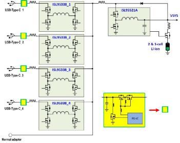 圖1. Intersil電池充電器架構(gòu) – 雙USB-C端口,采用兩個(gè)降壓-升壓穩(wěn)壓器和一個(gè)降壓充電器