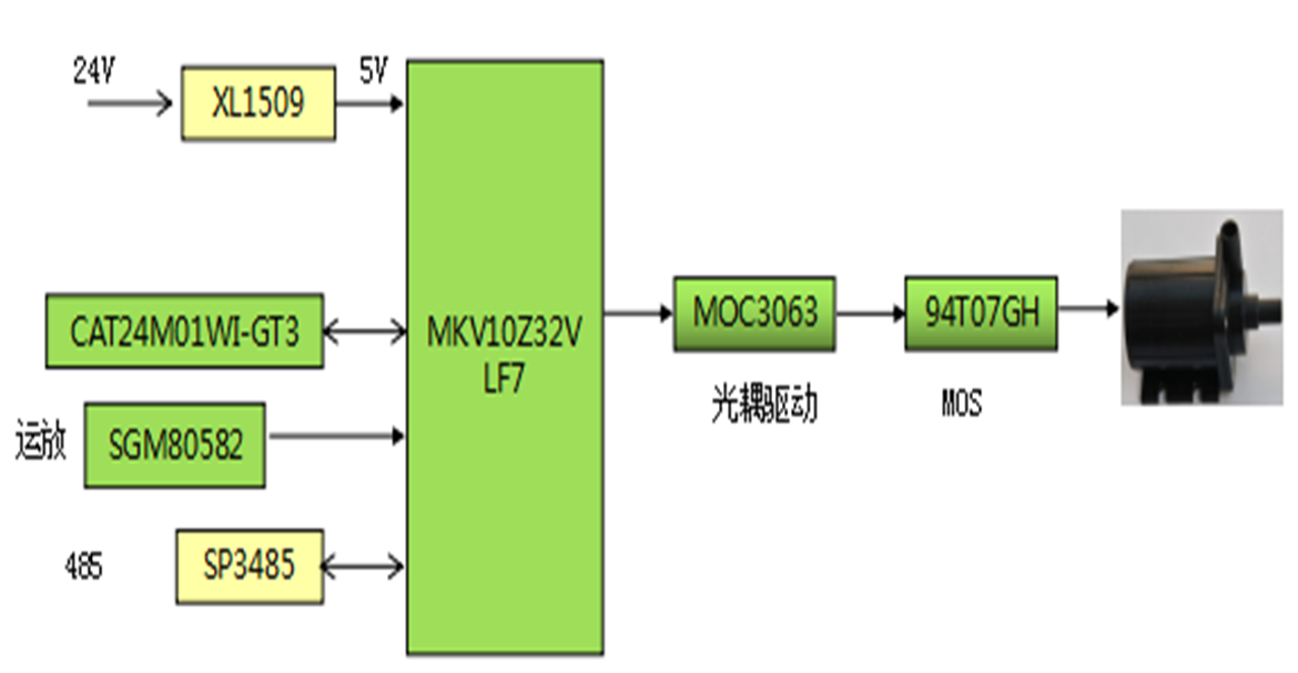BLDC電機(jī)控制板采用了NXP的MKV10Z32VLF7的MCU,來實(shí)現(xiàn)主機(jī)控制功能,通過485總線來實(shí)現(xiàn)信號的傳輸,電機(jī)驅(qū)動是通過光驅(qū)動MOC3063芯片和MOSFET的94T07GH來實(shí)現(xiàn)。