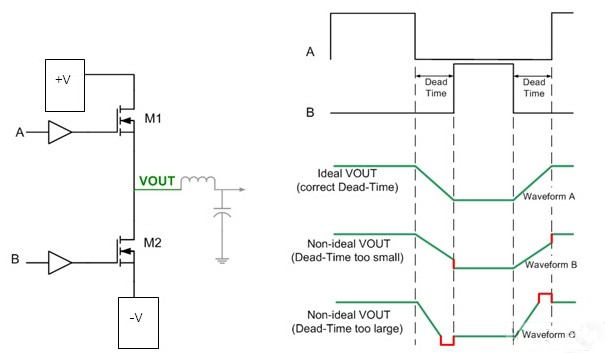 D類放大器死區(qū)時間(即兩個開關(guān)均處于關(guān)閉狀態(tài)時的時間段)直接影響到效率和THD。過于短暫的死區(qū)時間會引起直通電流,降低效率,過長的死區(qū)時間又會增大THD,這會給音頻保真度帶來不利影響。