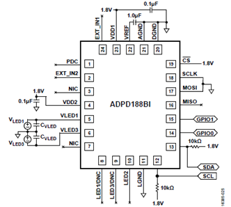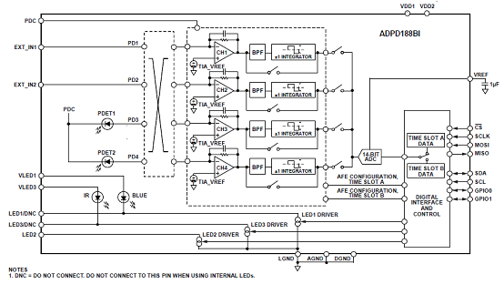 The ADPD188BI is a complete photometric system for smokedetection using optical dual wavelength technology. The module integrates a highly efficient photometric front end, two lightemitting diodes (LEDs), and two photodiodes (PDs). Theseitems are housed in a custom package that prevents light from going directly from the LED to the photodiode without first entering the smoke detection chamber. The front end of the application specific integrated circuit(ASIC) consists of a control block, a 14-bit analog-to-digital converter (ADC) with a 20-bit burst accumulator, and three flexible, independently configurable LED drivers. The controlcircuitry includes flexible LED signaling and synchronous detection. The analog front end (AFE) features best-in-class rejection of signal offset and corruption due to modulatedinterference commonly caused by ambient light. The dataoutput and functional configuration occur over a 1.8 V I2C interface or serial peripheral interface (SPI) port.