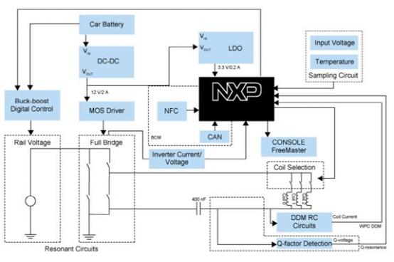 圖示1-應(yīng)用于汽車平臺(tái)的基于NXP產(chǎn)品的無(wú)線充電解決方案的系統(tǒng)方案圖