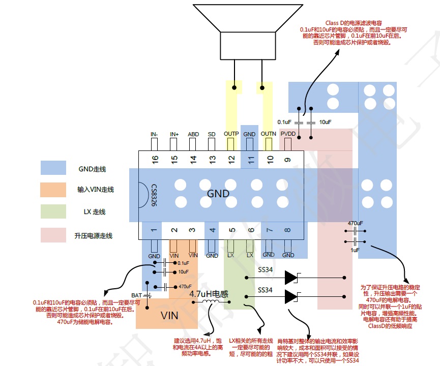 D、升壓輸出的走線也要盡可能粗,(圖中淡粉色部分),功放的供電都由這根線完成。470uF電容在肖特基附近,1uF并聯(lián)小電容緊鄰470uF電容;