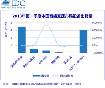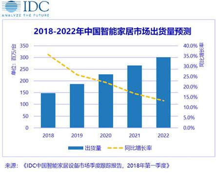 《IDC中國(guó)智能家居設(shè)備市場(chǎng)季度跟蹤報(bào)告》顯示,2018年第一季度中國(guó)智能家居市場(chǎng)出貨量2989萬臺(tái),同比增長(zhǎng)26.3%。其中視頻娛樂設(shè)備和其他(大小家電等)占整體出貨量的87.4%;此外,智能音箱、智能照明以及溫控設(shè)備同比增長(zhǎng)速度最快。預(yù)計(jì)2018年智能家居市場(chǎng)將達(dá)到1.5億臺(tái),同比增長(zhǎng)35.7%。預(yù)計(jì)到2022年該市場(chǎng)出貨量將突破3億臺(tái),其中主要增長(zhǎng)來源于家庭安全監(jiān)控、智能照明和智能音箱。