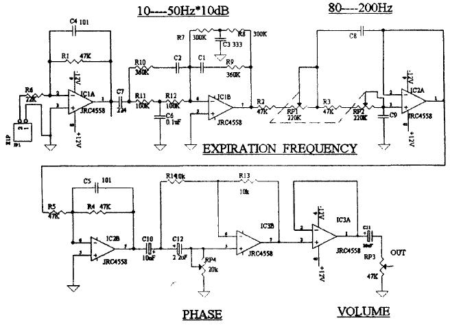 本文提供一種設(shè)計比較完善的超重低音前級信號處理部分電路,其中第一級為信號放大,根據(jù)需要可調(diào)整本級放大倍數(shù),第二級為50Hz以下超重低音的提升電路,這是一般低音炮電路所沒有的,第三級為頻率可調(diào)低通濾波器,調(diào)整范圍為80Hz-200Hz,第四級為隔離緩沖級,第五級為0-180度相位連續(xù)調(diào)整電路。這也是一般低音炮所沒有的功能單元,很有特色,最后一級也屬于隔離緩沖級,最后面為音量調(diào)整電位器。制作方而、其三塊雙運放可采用一般4558即可,供電電源為穩(wěn)壓電源±12-18V,由于電流很小,可由功率放大級電源經(jīng)電阻降壓取得,以簡化設(shè)計制作難度。對此電路感興趣者,可以根據(jù)需要予以適當(dāng)?shù)膭h減。