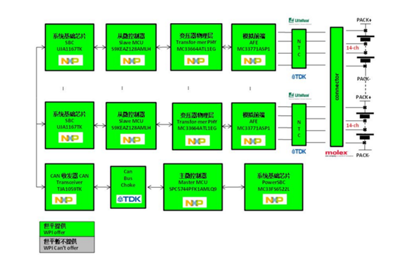 圖示1-基于NXP產(chǎn)品的BMS動力電池管理系統(tǒng)解決方案的系統(tǒng)方案圖