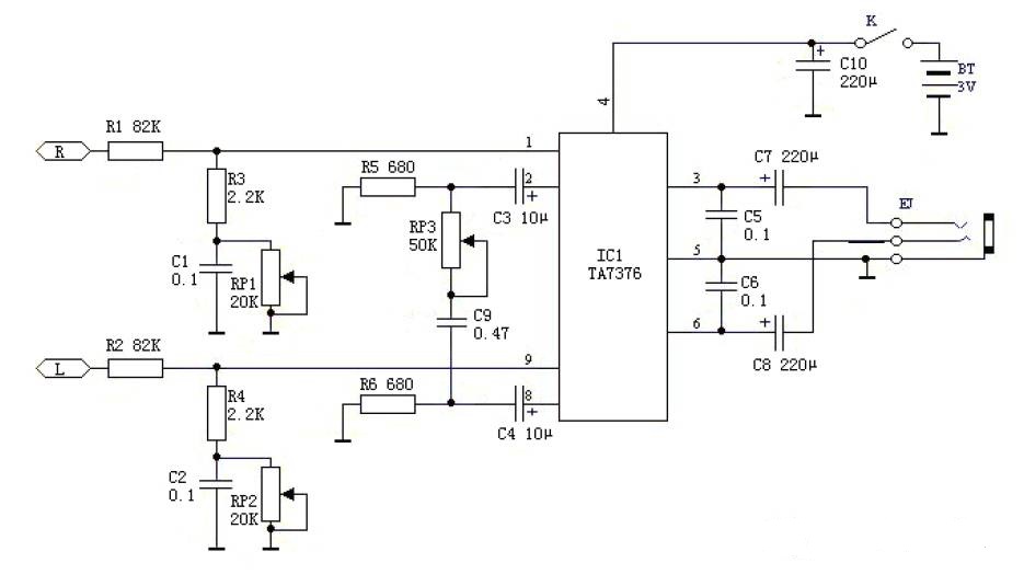 由電阻電容組成的低頻增強電路。利用功率放大器IC的反饋輸入,組成立體聲反相合成電路。利用功率放大器IC組成頭戴耳機的驅(qū)動電路。從輸入端IC之間的電阻電容起到增強低頻特性的作用,因為加有電位器,低頻部分的增強量可在0--10倍之間連續(xù)可調(diào)。立體聲反相合成電路IC 2腳和8腳的直流耦合電容之后,由0.47μF和50K的電位器組成。在此電路中,把立體聲的廣場效果成分中的高音部分左右分別反相后合成,起到增強效果的作用。用東芝TA7376P推動頭戴式耳機。這種IC內(nèi)藏兩個通道,外接元件少,可在低電壓下工作。負(fù)載阻抗較低時,可重放出動人效果的低頻聲音 。電源若改用5#電池,用四只串聯(lián),電壓為6V,可直接驅(qū)動高輸出的揚聲器。若將三個200μF/10V的電容增加到1000μF左右,可獲得更好的效果。