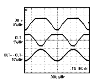 MAX9730和MAX9788可以確保在兩個電源之間切換不會產生音頻雜音。當輸出信號達到VCC和GND供電所允許的極限時,負電源被自動連接至輸出級。這樣,輸出信號不會在負擺幅側出現(xiàn)削頂,但仍會鉗位其正擺幅。為了校正這一點,放大器給負極性輸出增加額外的校正信號,如圖2所示。分別觀察正、負輸出時,正半周波形被明顯削頂,而負半周存在明顯失真。盡管這些信號出現(xiàn)了嚴重的失真,但卻被嚴格控制,充分利用了該架構的優(yōu)勢。施加到負載上的實際輸出信號沒有失真。