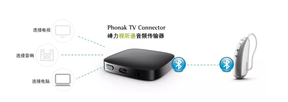 神通系列助聽器可以與視聽通音頻傳輸器 (Phonak TV Connector) 實現(xiàn)藍(lán)牙配對,將高清優(yōu)質(zhì)的音頻從電視機或者立體聲音響上,直接無線傳輸?shù)街犉,使用者可以與家人朋友一起收聽,不必?fù)?dān)心音量過大影響他人。視聽通音頻傳輸器搭載 AirStream 技術(shù),傳輸無延遲、更清晰,同時支持立體聲音頻輸出。