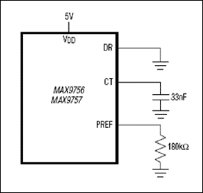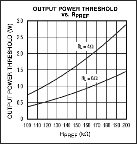 連接于PREF和地之間的一只外部電阻設(shè)定了鉗制揚聲器輸出的門限(圖7)。公式1給出了這個電阻值和最大預(yù)期輸出功率及揚聲器阻抗的關(guān)系。