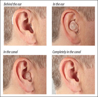 耳背式(BTE)、耳內(nèi)式(ITE)、耳道式(ITC)和完全耳道式(CIC)助聽器,Starkey Laboratories, Inc.授權(quán)照片。