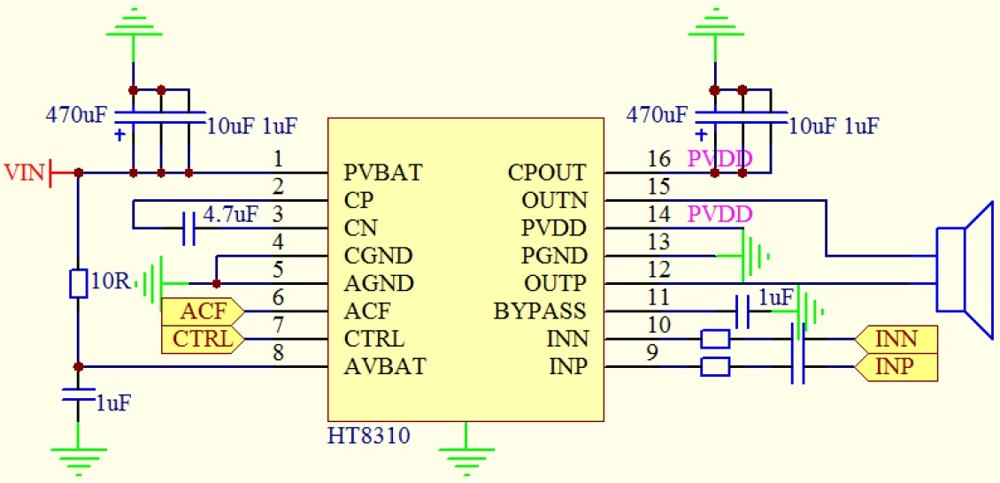 HT8310內(nèi)部集成免濾波器數(shù)字調(diào)制技術(shù),能夠 直接驅(qū)動(dòng)揚(yáng)聲器,并最大程度減小脈沖輸出信號(hào)的失 真和噪音。輸出無(wú)需濾波網(wǎng)絡(luò),極少的外部元器件節(jié)省了系統(tǒng)空間和成本,是便攜式應(yīng)用的理想選擇。
