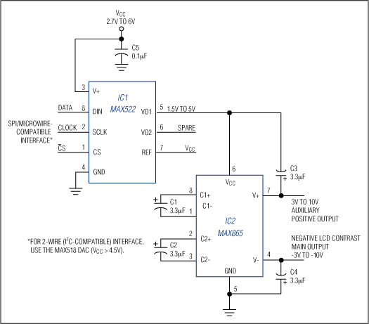 圖1. 該可調(diào)負壓由8位、串行輸入DAC控制的反相倍壓型電荷泵構(gòu)成