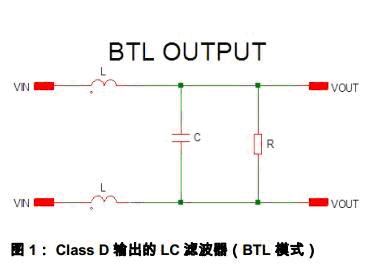 圖1是一個(gè)典型的Class D 輸出濾波網(wǎng)絡(luò)(BTL 輸出模式)。LC 濾波器由L,C 和負(fù)載R 組成。