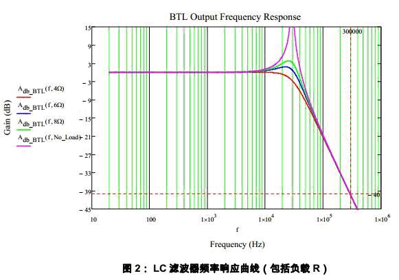 該例子中L=15uH,C=1uF,截止頻率Fn約為29kHz,在Class D 的開關(guān)頻率(約300kHz)位置提供-40dB 的衰減。在截止頻率處,不同的負(fù)載阻抗呈現(xiàn)出不同的增益。理論上空載極端情況下增益為無(wú)限大,LC 進(jìn)入諧振狀態(tài)。