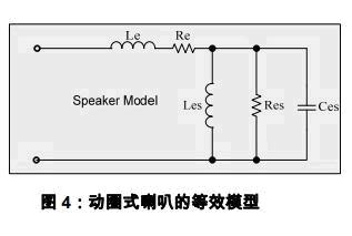 動(dòng)圈式喇叭的阻抗特性可以使用圖4中的等效電路模型來(lái)模擬(等效電路模型的詳細(xì)分析請(qǐng)參見引用2)。其中: