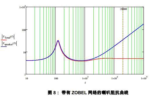 實(shí)際喇叭的高頻阻抗因?yàn)榫圈電感而呈現(xiàn)隨頻率增高而上升的趨勢(shì),由此導(dǎo)致了LC濾波網(wǎng)絡(luò)的高Q值。ZOBEL是和喇叭并聯(lián)的阻容網(wǎng)絡(luò),它可以用來(lái)補(bǔ)償喇叭的感性而抑制喇叭阻抗的抬升。如圖7所示,ZOBEL網(wǎng)絡(luò)有電阻和電容組成。計(jì)算公式為(參見引用3):