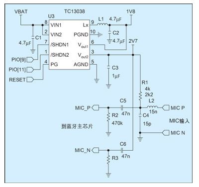 MOSFET,采用2MHz的開(kāi)關(guān)頻率,轉(zhuǎn)換效率達(dá)到92%以上。高開(kāi)關(guān)頻率和PWM/PFM自動(dòng)切換技術(shù)可使工程師選擇低至2.2μH的表貼電感和陶瓷電容,即可滿足濾波和藍(lán)牙芯片對(duì)紋波的要求。TC1303內(nèi)集成的LDO可提供300mA的輸出電流,且只有137mV電壓差。為了進(jìn)一步減小DC/DC開(kāi)關(guān)噪聲對(duì)電路設(shè)計(jì)的影響,在芯片設(shè)計(jì)時(shí)將LDO的電源地引腳和DC/DC電源地引腳分開(kāi),保證了LDO輸出可以給I/O部分和麥克風(fēng)提供“干凈”的電壓。