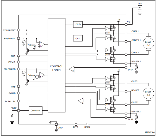 The STSPIN840 embeds two independent PWMcurrent controllers (one for each full bridge) basedon user settable values of reference voltage andOFF time.The devices can be forced in a low consumptionstate reducing the total current consumption downto less than 45uA.